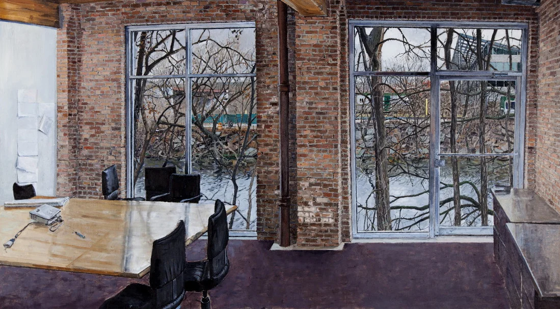 TEMPORARY OFFICES, EVERGREEN PROPERTIES, OIL ON LINEN, 32X50'', 2014/2015